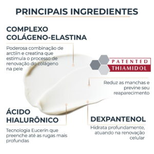 Eucerin Hyaluron-Filler+Elasticity Creme Antirrugas Noite é um produto ideal para reduzir rugas profundas e linhas de expressão, desenvolvido com Ácido Hialurônico de cadeias curtas e longas, que hidrata, preenche rugas profundas e estimula a produção de ácido hialurônico. Sua fórmula também contêm Thiamidol, um ativo reconhecido pelos dermatologistas como o mais eficaz e o único comprovado por atuar na causa raiz das manchas, Complexo Colágeno-Elastina, combinação de Arctiin e Creatina que acelera a produção do colágeno e melhora a elasticidade da pele, Dexpantenol e Óleo de Argan, que auxiliam na renovação da pele.
